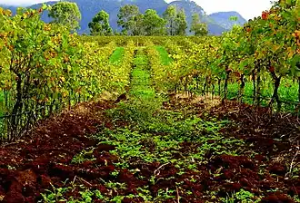 Overall, the Hunter Valley has more soils (mostly hard, acidic patches of poorly draining heavy clay) that are unsuitable for viticulture than they have areas that are ideal for growing grapes. The soils of the Lower Hunter vary widely from sandy alluvial flats (often planted to Semillon), to deep friable loam (often planted with Shiraz) and friable red duplex soils. In the Upper Hunter, the rivers and creeks of the region contribute to the areas black, silty loam soils that are often overlaid on top of alkaline clay loam.[1] Among the hills of the Brokenback range are strips of volcanic basalt that are prized by growers for their tendencies to restrict vigor and concentrate mineral flavours in the grapes.[2]