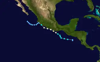 Early on June 15, a ship reported winds of 40 mph (65 km/h) and 13 ft (4.0 m) seas, which prompted the Eastern Pacific Hurricane Center (EPHC) to upgrade the depression to Tropical Storm Bridget. The storm maintained a general northwest track toward the southwest Mexican coastline. It gradually intensified, and satellite images late on June 16 indicated that Bridget attained hurricane status about 55 mi (95 km) southwest of Puerto Ángel, Oaxaca.[2] It quickly intensified as it neared the coast, reaching winds of 100 mph (155 km/h) just southwest of the Acapulco coastline before weakening.[3] Bridget paralleled the Mexican coastline just offshore before making landfall at 1200 UTC on June 17, about 100 mi (160 km) southeast of Manzanillo, Colima. The hurricane rapidly weakened over the mountainous terrain, emerging into the Pacific Ocean as a tropical depression after being over land for only a few hours.[2] Bridget turned westward as a weak tropical cyclone, eventually dissipating on June 20 to the south of the Baja California peninsula.[3]