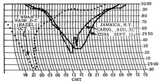 - ^ a b c d e f g h i Malkin, William; Holzworth, George C. (September 1954). "Hurricane Edna, 1954" (PDF). Monthly Weather Review. 82 (9). American Meteorological Society: 267–279. Bibcode:1954MWRv...82..267M. doi:10.1175/1520-0493(1954)082<0267:HE>2.0.CO;2. Retrieved February 1, 2011.
