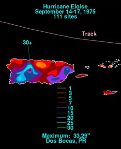 Despite being only a tropical storm while passing by Puerto Rico, Eloise produced extreme amounts of rainfall on the island, peaking at 33.29 inches (846 mm) in Dos Bocas. Other totals of 10 to 20 inches (250 to 510 mm) were common.[10] The heavy rains resulted in severe flash flooding which killed 34 people, mostly from drownings, and left $60 million in damages.[11] Several hundred people were injured, and the storm forced over 6,000 residents from their homes. Dozens of towns and villages were flooded, though Utuado, with a population of 35,000 at the time, was hit the hardest. The situation in that town was described as a "total disaster"; four housing developments were under water, and dozens of vehicles were washed away.[12] The flood waters submerged thousands of miles of roads and put several bridges out-of-service.[13]