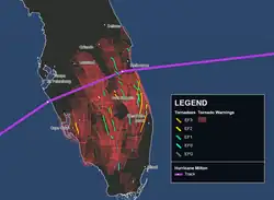 ![]() Map of tornadoes and tornado warnings associated with Milton in Florida. | |