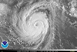 On October 7, Hurricane Norbert reached Category 2 intensity on the Saffir-Simpson Hurricane Scale while Norbert developed well-defined and closed eyewall as seen in microwave imagery.[8] Overnight on October 8, an eye appeared on infrared satellite, indicating that Norbert was intensifying and the storm was upgraded to a major hurricane respectively.[9] Continuing to rapidly strengthen over warm sea surface temperatures, it reached Category 4 status late on October 8, after intensifying 45 mph (72 km/h) over the previous 24 hours. The storm peak intensity was 135 mph (217 km/h) and a peak pressure of 945 mbar (hPa; 27.91 inHg) while located 350 mi (560 km) south of Cabo San Lucas, Baja California Sur. The peak intensity of Norbert is uncertain as aircraft-based wind speed observations were lower than estimates via Dvorak Technique.[1] However, the cloud pattern became less impressive early on October 9, and was thus downgraded into a Category 3 hurricane, with winds of 125 mph (201 km/h) as it moved.[10] The eye began to erode and as such Norbert underwent an eyewall replacement cycle, where one eye is replaced by another. As a result, when Hurricane Hunters investigated the storm later that day, they found that Norbert had weakened considerably. At that time, it was downgraded into a weak Category 1 hurricane on October 9.[1]