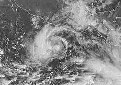 About six hours after forming, the circulation of the depression became exposed from the deep convection, due to the wind shear. At the same time, two tropical cyclone forecast models predicted the tropical cyclone formation of a larger disturbance to the southeast of the depression.[4] One model predicted the new cyclone to absorb the depression, although most other models forecast for the depression to remain the dominant system.[5] By early on October 5, deep convection developed and organized around the center of the depression, and satellite intensity estimates using the Dvorak technique suggested that the system had tropical storm force-winds; as a result, the NHC upgraded the depression to Tropical Storm Norbert, about 245 mi (395 km) south of Zihuatanejo.[6] Norbert slowly intensified,[1] and was upgraded to a hurricane on October 6 as very deep atmospheric convection remained stable despite easterly wind shear.[7]