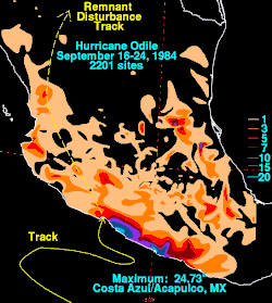 Hurricane Odile was the second of three tropical storms to make landfall in Mexico during the 1984 Pacific hurricane season. The fifteenth named storm and twelfth hurricane of the active season, it developed from a tropical disturbance about 185 miles (298 km) south of Acapulco on September 17. Curving towards the northwest, Odile became a Category 1 hurricane on September 19. The tropical cyclone reached its peak intensity with winds of 105 mph (169 km/h) two days later; however, Hurricane Odile began to weaken as moved erratically it encountered less favorable conditions and was downgraded to a tropical storm shortly before making landfall northwest of Zihuatanejo. Over land, the storm rapidly weakened, and dissipated on September 23. The storm caused significant rainfall accumulations of 24.73 inches (628 mm) in Southern Mexico, resulting in severe damage to tourism resorts. Flooding from Odile resulted in the evacuation of 7,000 people, 21 deaths, and the damage of about 900 homes.
