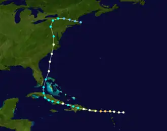 The system moved west-northwestward across the Mona Passage and struck the Dominican Republic, weakening to a tropical storm on September 14 as it traversed Hispaniola.[1] The storm briefly re-attained Category 1 hurricane status while crossing the Windward Passage early on September 15, based on a 2000 re-analysis by meteorologist Louis A. Pérez Jr., and soon made landfall in Cuba near San Antonio del Sur.[1][5] Weakening to a tropical storm, the cyclone continued west-northwestward until turning northward over the central part Cuba early on September 16, several hours before emerging into the far southwestern Atlantic.[1] At 18:00 UTC, the system passed about 30 mi (48 km) west of Grand Bahama and about 40 mi (64 km) east of present-day Palm Beach, Florida.[1] Based on land and ship observations, the storm re-intensified into a hurricane on September 17,[5] though Chenoweth's study found that it had remained a hurricane over the past three days.[4] The hurricane made landfall in North Carolina between Surf City and Topsail Beach around 14:00 UTC with winds of 90 mph (150 km/h). Moving parabolically across the interior of the United States, the cyclone weakened to a tropical storm over Virginia early on September 18 and to a tropical depression about 24 hours later over New York. Late on September 19, the depression dissipated near Cape Cod, Massachusetts.[1]