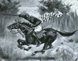 Hussein's famed horse Mangalool was the topic of poetry and envy across Somaliland and many notables would inquire about how they could obtain the steed both Somalis and British alike.[3] Hussein would accompany Lord Delamere in 1893 on a lion hunting expedition in which a lioness nearly killed him and his horse Mangalool in a pursuit they narrowly escaped.[4] Hussein would refuse to put a price on Mangalool as he was nearly impossible to catch after raids and he made a great income off looting livestock from his enemies. He would run into Lord Delamere again in 1894 and narrated an amazing story that happened to him in the year since. Following a successful raid of numerous camels, Hussein had split from his party to avoid detection. Given that it was a particularly dry year Mangalool had collapsed from fatigue and could not continue any further. To rescue his horse, Hussein rushed his looted camels to the nearest wells and made them drink as much water as possible, before returning to Mangalool. He then slaughtered a camel periodically along the 20 mile route back to the safe well and would give Mangalool water from the camels he killed. He stated he would rather kill 100 camels than lose his horse, and that with Mangalool he'd easily gain many more camels than he slaughtered now that he had his horse back.[4]