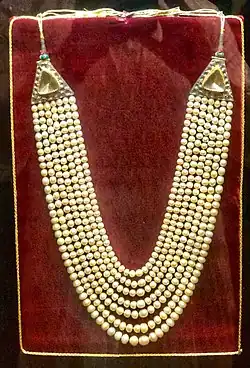 The pearl industry in Hyderabad flourished due to the patronage of the Qutub Shahi kings and the Asaf Jahis, who were said to have an affinity for sparkling jewels.[1] The pearls were not only part of the traditional regalia of this royal clientele but the pearls' crushed form are also believed to have healing and beautifying properties. Princesses were said to be weighed against their pearls during their birthdays while Mir Osman Ali Khan, who is considered the richest among the Nizams, was said to have hoarded sacks of pearls in the basement of his palaces.[2]