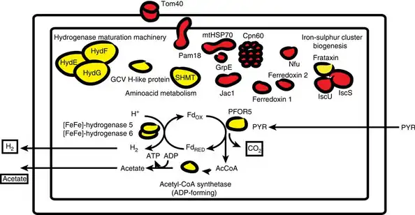 - ^ Schneider RE, Brown MT, Shiflett AM, Dyall SD, Hayes RD, Xie Y, et al. (November 2011). "The Trichomonas vaginalis hydrogenosome proteome is highly reduced relative to mitochondria, yet complex compared with mitosomes". International Journal for Parasitology. 41 (13–14): 1421–34. doi:10.1016/j.ijpara.2011.10.001. PMC 4437511. PMID 22079833.