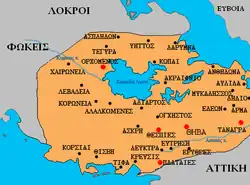 Its acropolis is located on a low hill, crowned by a chapel of Agios Athanasios, in a locality called Dendri, approximately three km NNE of the village of Pavlos, Viotias.[5][6] On the west side of the acropolis, a stretch of polygonal fortification wall preserves a number of inscriptions of the 4th or 3rd century BCE listing young men serving in the local self-defense force. Also on the W slope are stalactite caves.