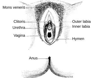 The hymen is a thin piece of mucosal tissue that surrounds or partially covers the vaginal opening. A small percentage of females are born with hymens that are imperforate and completely obstruct the vaginal canal. It forms part of the vulva and is similar in structure to the vagina.[1][2] The word is from the Greek ὑμήν meaning a thin skin or membrane.[3]