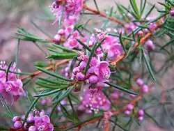 Hypocalymma strictum is an erect shrub that typically grows to a height of 0.2–1.5 m (7.9 in – 4 ft 11.1 in) and often has many branches. Its young stems are obscurely 4-angled, brown and more or less glabrous. The leaves are linear, 6–11 mm (0.24–0.43 in) long and about 0.8 mm (0.031 in) wide and triangular in cross section, with a few pointed glands. The flowers are arranged in pairs in leaf axils and are more or less sessile or sometimes on a peduncle up to 2 mm (0.079 in) long. There are bracts and bracteoles at the base of the flowers but fall off as the flowers open. The sepal lobes are broadly elliptic, 1.5–2.0 mm (0.059–0.079 in) long and pale pinkish. The petals are pink, more or less round, about 3 mm (0.12 in) in diameter, and there are 30 to 50 pink stamens, the filaments sometimes longer than the petals. Flowering occurs from December to April.[2][3]
