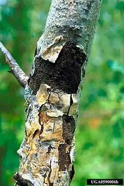 Hypoxylon canker of shade trees is a weak ascomycete fungus that negatively affects growth and can eventually lead to the death of weak or diseased host trees.[1] There are many different species that affect different trees. For example, Hypoxylon atropunctatum, a common species, is found on oak trees, Hypoxylon tinctor affects sycamore trees, and Hypoxylon mammatum infests aspen trees.[1][2][3]