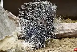 Cape porcupines are the largest rodents in Africa and also the largest species of porcupine. Cape porcupines are amongst the largest living rodents in the world; a few other rodents appear to be larger in body mass such as the capybara and the Eurasian and North American beavers.[2][3][4] They are similar in appearance to the slightly smaller and closely related crested porcupine. They can most easily be distinguished from them by the presence of a band of short white spines along the midline of the rump. Indian porcupines are almost the same size on average as well, being slightly heavier on average than crested porcupines but slightly lighter than Cape porcupines.[5][6]