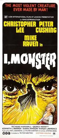 I, Monster is a 1971 British horror film directed by Stephen Weeks (his feature debut) and starring Christopher Lee and Peter Cushing.[1] It was written by MIlton Subotsky, adapted from Robert Louis Stevenson's 1886 novella Strange Case of Dr. Jekyll and Mr. Hyde, with the main characters' names changed to Dr. Charles Marlowe and Mr. Edward Blake.[2] It was produced by Amicus.