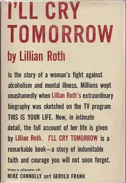 I'll Cry Tomorrow is a 1954 autobiography by Lillian Roth, co-written by Roth, Gerold Frank and journalist Mike Connolly. It is a "brutally frank" depiction of Roth's alcoholism, one of the earlier books by a celebrity on addiction, and influential in drawing attention to alcoholism as a disease.[1][2][3] It sold over 7 million copies in 20 languages. It was adapted into the 1955 film of the same name.[4]