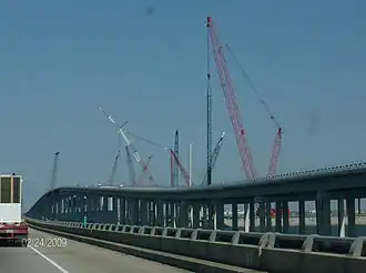 The high-rise portion under construction near the North Shore of Lake Pontchartrain, February 2009, with the old eastbound span also visible | |