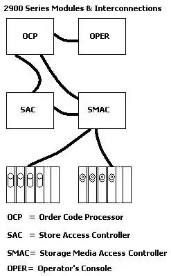 A 2900 Series machine was constructed from a number of functional modules, each contained in a separate cabinet. Peripheral devices were connected using ICL's Primitive Interface (Socket/Plug and cable set) to a Port Adapter on the SMAC. Logical addressing was employed and used a group scheme to identify system components in terms of Ports, Trunks, and Streams.