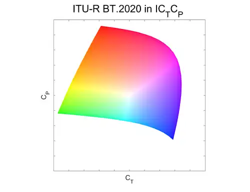 ICTCP, ICtCp, or ITP is a color representation format specified in the Rec. ITU-R BT.2100 standard that is used as a part of the color image pipeline in video and digital photography systems for high dynamic range (HDR) and wide color gamut (WCG) imagery.[1] It was developed by Dolby Laboratories[2] from the IPT color space by Ebner and Fairchild.[3][4] The format is derived from an associated RGB color space by a coordinate transformation that includes two matrix transformations and an intermediate nonlinear transfer function that is informally known as gamma pre-correction. The transformation produces three signals called I, CT, and CP. The ICTCP transformation can be used with RGB signals derived from either the perceptual quantizer (PQ) or hybrid log–gamma (HLG) nonlinearity functions, but is most commonly associated with the PQ function (which was also developed by Dolby).