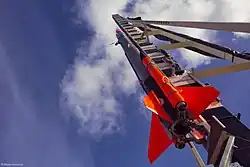 The rocket is 5 meters tall and has a diameter of 230 mm.[4] It consists of two solid boosters and hybrid main engine. The main engine is a Polish construction which uses highly concentrated hydrogen peroxide as oxidiser. High test peroxide is produced in-house by the Institute of Aviation and has a concentration of 98%, offering increased specific impulse and density in comparison with the more commonly used 85-87.5% peroxide.[1] AMBER has a reusable head. The recovery of payload is done by pyrotechnical separation from head and deploying drogue and main parachutes. The payload touches down on the ground at a speed of about 8 m/s.[3][5][6]