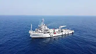 Nireekshak was originally built by M/S Mazagon Dock Limited, Mumbai, for the Oil and Natural Gas Corporation's offshore oil exploration work, having a dynamic position facility and a recompression chamber. It was however acquired on lease with an option for purchase by Indian Navy and was commissioned on 8 June 1989. The ship was modified and refitted with the diving bell and other rescue equipment removed from the former Russian submarine rescue vessel INS Nistar in a dry dock. In March 1995 the purchase option was invoked and the vessel was formally re-commissioned on 15 September 1995. The ship is equipped with two Deep Submergence Rescue Vehicles (DSRV), capable of taking 12 men to 300 meters together, with two six-man recompression chambers and one three-man diving bell. It is intended to facilitate rescue from a submarine in distress and training of saturation divers. Its pennant number is A-15.[1][4][5]