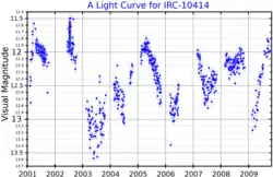 IRC −10414 has been reported as a likely variable with a period of 768 days and an amplitude of over a magnitude.[12] Observations of a long series of All Sky Automated Survey observations again showed variability with an amplitude over a magnitude, but with a period of 2,726 days. The variability is unlikely to be regular and the most likely classification is given as semiregular.[5] It is not yet listed in the General Catalogue of Variable Stars.[13]