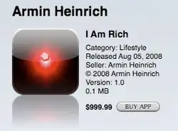 Heinrich released and distributed I Am Rich through the App Store[2] on August 5, 2008.[4] The app was sold for US$999.99 (equivalent to $1,460 in 2024), €799.99 (equivalent to €1,078 in 2023), and £599.99 (equivalent to £1,011 in 2023)—the highest prices Apple allowed for App Store content.[3][5] The application was removed from the App Store without explanation by Apple less than a day after its release.[4]