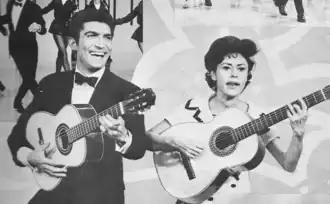 Caterina Valente was born in Paris on 14 April 1931[2][3] to Italian parents Giuseppe Valente (from San Biagio Saracinisco) and Maria Siri (born in Rome to a Genoese family).[4][5][6] Her parents were musicians from a family that had been in show business for seven generations. Her mother was a varieté artist and a mime.[7] The girl's first love was jazz; she listened to Duke Ellington, Sidney Bechet, Louis Armstrong and Bessie Smith at home. When she listened to Billie Holiday first, at about age five, she cried and knew that she wanted to become a singer.[7] She was trained in ballet early.[2] She toured with her parents in the 1930s, sometimes appearing on stage;[8] her career began in 1936 at the Friedrichsbau theatre in Stuttgart.[9] She appeared as guitarist in a family sextet with her parents and three siblings.[2]