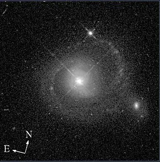 The nucleus of I Zwicky 1 is found to be active. It is classified as a prototypical narrow-line Seyfert 1 galaxy[7][8][9] and contains high amounts of X-ray luminosity.[10][11] The galaxy contains a peculiar spectrum, which in addition to the usual broad- and narrow-line regions, there are two emission regions emitting broad and blue shifted [O III] lines making it a peculiarly interesting object.[12] The QSO sits inside its host galaxy which is revealed to be a face-on spiral galaxy. It shows two asymmetric spiral arms and knots of star formation.[3] This makes I Zwicky 1 an ideal candidate for studying properties of QSO hosts.[2] It is also possible that certain tidal interactions triggers activity in I Zwicky 1, both starburst and QSO.[13]