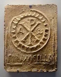 Decorated ceramic tiles are paleochristian ceramic bricks with relief designs made by molding, used in the architecture of Late Antiquity in the south of the Iberian Peninsula, with two production centres identified in the valley of the Guadalquivir.[1] The decorative motifs are mostly religious (in particular, the Chi Rho),[2] although there are also zoomorphic and vegetal examples. Their function is not known, although use as funerary or, more recently, as ornamental elements in ceilings have been proposed .[1]