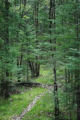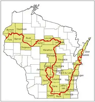 The trail roughly follows the location of the terminal moraine from the last Ice Age. As the route traverses the moraine, it sometimes meanders into areas west of the moraine, including the Driftless Area in southwestern Wisconsin. The trail passes through 30 of Wisconsin's 72 counties, from the northwestern part of the state to the Lake Michigan shoreline in the east.[6] The western end of the trail is at Interstate State Park along the St. Croix River, which is the border between northwestern Wisconsin and eastern Minnesota. The eastern terminus of the Ice Age Trail lies at Potawatomi State Park, on Wisconsin's Door Peninsula near the city of Sturgeon Bay.[7]