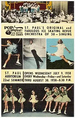 An ice show is an entertainment production which is primarily performed by ice skaters.[1][2] The major ice shows were founded between 1936 and 1943, when professional figure skaters began to appear in shows, in hotels, at fairs, and "at any place a sheet of ice could be set up" since the beginning of the 20th century in North America and Europe.[3] They were produced and toured North America, Europe, and throughout the world for many years in the years following World War II. According to figure skating historian James R. Hines, ice shows "took spectacular skating to large audiences, contributing to the development of the sport's first major fan base".[3]
