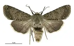 Ichneutica moderata is a moth of the family Noctuidae.[2] This species is endemic to New Zealand and can be found from the Bay of Plenty south including the Chatham Islands. I. moderata inhabits open spaces in lowland to montane zones. Larvae likely feed on a variety of low growing herbaceous plants including on Raoulia species. Larvae create silk covered tunnels in the roots of their host plants. Pupa are enclosed in a loose silken cocoons and are sheltered amongst the host species roots. The adult moths are on the wing from October to April.