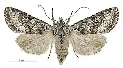 ♀. 42 mm. Head, palpi, thorax fuscous mixed whitish and blackish. Forewings elongate-triangular, termen obliquely rounded, waved; grey, irrorated blackish and whitish; a small white spot in middle of base; lines white, blackish-edged, waved, subbasal curved, first rather irregular, slightly bent on fold, second sinuate, subterminal parallel to termen, slightly indented near extremities; median band darker grey irrorated blackish, without white irroration, median shade obscurely blackish, dentate; spots outlined white and then blackish, claviform small, wedged-shaped, resting on first line, orbicular rather oblique, oval, reniform narrow slightly bent in middle : cilia grey narrowly barred white. Hindwings grey; cilia light grey, slenderly barred whitish, outer half whitish.[3]