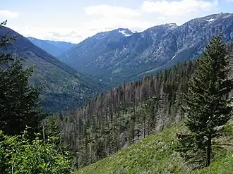Eastern slope of Icicle Ridge (green hill) at its junction with 4th of July trail viewing towards Big Lou on the right and Grindstone Mountain at the far center | |