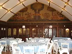 In 1987, the gymnasium was converted into Max Palevsky Cinema. Since that time, Doc Films has screened movies every night of the academic year.[6] In 1995, the murals on the third floor, originally created in 1918 to commemorate the quarter centennial of the University of Chicago and the opening of Ida Noyes Hall, were restored.[7][8] In 2007, the building underwent repairs to address a crumbling facade and leaking roof, and in 2008, the University's Booth School of Business renovated the natatorium to create additional study space for student study groups.[9][10][11]