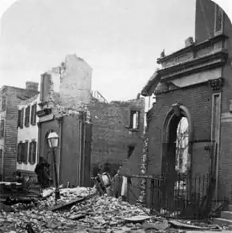 After supporting Barry Sullivan in his 1875 engagement at Booth's Theatre,[94] Vernon rejoined the Union Square Theatre Company in December 1876 for a new presentation of The Two Orphans. This would be at the Brooklyn Theatre, with Kate Claxton and Vernon reprising their original roles.[95] On Tuesday evening, December 5, 1876, Vernon finished her part and left the theater with the final scene yet to play. She wasn't needed for the finish, so she returned to her rooms at No. 28 Johnson Street, two doors away from the Brooklyn Theatre. She was taking care of her brother, Capt. J. B. MacGowan, who suffered from "pulmonary affectation". He had been near death for several weeks; Vernon employed caretakers to watch him while she performed. Kate Claxton later testified that the Brooklyn Theatre fire broke out two minutes into the last scene of the play. Vernon heard the alarm and was able to get her brother out of the house before it too burned. She escaped with him to the nearby Pierrepont House, clad only in her dressing gown.[4] The conflagration killed over 275 people, including some actors and stage hands, with the majority of casualties coming from audience members in the upper galleries. Vernon was once again nearly destitute,[4] as after Richmond in April 1865, but was able to recover her jewels from the wreckage of her dressing room.[96]