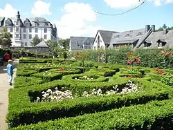 A 20-metre-long stone bridge spans the neck ditch between the outer and inner baileys. To its right is a small Renaissance garden. Guided tours are offered with the guides dressed as gardeners of 1702.[6]