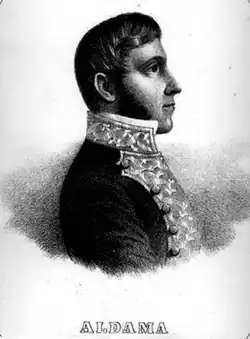 Ignacio Aldama was born in San Miguel de Allende, Guanajuato. He was a lawyer, but devoted himself to commercial projects with marked success. From the beginning of the Mexican War of Independence he joined Miguel Hidalgo y Costilla, was soon promoted to the rank of general, and was then appointed minister to the United States, in hope of obtaining help from this nation. But, on reaching Bejar, he found that some insurgents, led by Juan Manuel Zambrano, were preparing a revolt against the revolutionary authorities. These being overpowered by the new insurgents, March 1, 1811, Aldama was arrested and sent to Monclova, where he was executed on June 20, 1811.