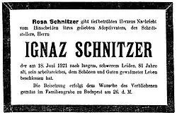 - ^ Ignaz Schnitzer.. In: Pester Lloyd, 28 June 1921, p. 4 (Online at ANNO)