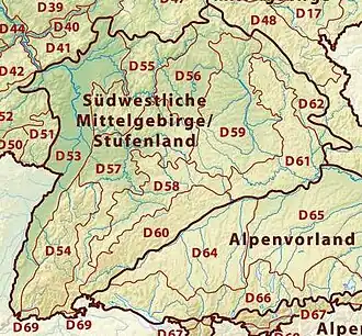 In the northwest the Iller-Lech Plateau borders on the Swabian Jura (unit D60 on the map) and, in the extreme northeast, on the Franconian Jura (unit D61 on the map). The boundary with these two natural regions is roughly formed by the course of the river Danube.