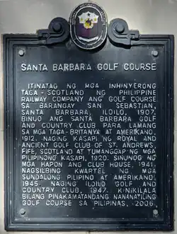 The golf course was established as the Santa Barbara Golf Course in 1907 by a group of Scottish expatriates involved in building the Panay line of Panay Railways, completed the same year. It opened to the public in 1913 as a basic 9-hole course.[3] Initially, the club was exclusive to English and Scottish migrants, but by the late 1920s, wealthy Filipino landowners gained entry, including Mariano Cacho, Oscar Ledesma, Tomas Confesor, William Gemperle, and the brothers Eugenio and Fernando Lopez. With the establishment of the Philippine Commonwealth in 1935, more Filipinos became involved in government and business, further enhancing Iloilo’s mestizo elite to acquired economic power.[4]