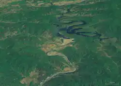 ![]() View of the dam as seen by Landsat, 3D elevation model (yellow item in the middle of the image). | |