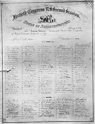 - ^ "Journal of the United States House of Representatives (40th Congress, second session) pp. 393–397". voteview.com. United States House of Representatives. 1868. Retrieved March 16, 2022.