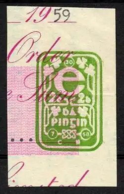 A pre-printed revenue stamp is a type of revenue stamp where the stamp is incorporated into the design of the document and printed at the same time as the rest of the document.[3] They are distinct from impressed duty stamps in being neither impressed nor embossed. Pre-printed revenue stamps were often included in the design of cheques to prevent the need to separately stamp each cheque. They are also found incorporated into the design of stock certificates and are analogous to imprinted stamps in the postal field without the embossing sometimes found there. They also have similarities to stamped paper, but unlike stamped paper, where the stamp is usually large and the rest of the paper blank, the pre-printed revenue stamp is normally only a small part of the document, perhaps appearing in a corner, and often no larger than a typical postage stamp.