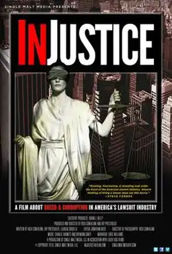 InJustice is a 2011 documentary film produced and directed by Brian Kelly. The film features the impact of tort reform on the United States judicial system. The documentary focuses on how the class action lawsuit, born from the Civil Rights Act of 1964, was skillfully managed by a small group of trial attorneys who manipulated legal rules, procedures — and even their own clients — to become an international enterprise that rivals the scope and profits of Fortune 500 corporations.[1] How lawyers managed to maneuver their way into millions and billions by scamming the judicial system via class action lawsuits.[2][3]