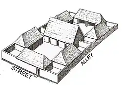 Kanchas could have quite different sizes ranging from a large city block to a small enclosure. Also the number of buildings within a kancha varies, including up to eight or more structures.[3] Kanchas were sometimes laying side by side forming a larger unit, or a block. These were generally surrounded by streets or alleys and the entrances to single kanchas would lay on different sides.