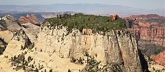 Inclined Temple, a mesa-like formation composed of Navajo Sandstone, is situated 7.0 mi (11.3 km) north of Springdale, Utah. Its nearest neighbor is Ivins Mountain, one half mile to the north, and South Guardian Angel is set approximately three miles to the west-northwest. Its name was officially adopted in 1935 by the U.S. Board on Geographic Names.[2] This geographical feature is so named because its broad top has a decided incline.[2] Precipitation runoff from this mountain drains into North Creek, a tributary of the Virgin River.