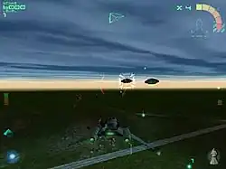 There are three different game modes. The campaign mode follows the main storyline, in which the player must complete a series of objectives to neutralise the alien threat. Typical goals include transporting cargo and defending allied convoys.[6] Two variants of the campaign exist: "campaign action" purely consists of the simulation missions; "campaign tactics" features the same main missions as campaign action, but with some extra sub-missions. These sub-missions take place in the "tactical display", where the player controls several vehicles and gun emplacements in a similar manner to real-time strategy games.[5]