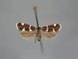 The wingspan is 11–14 mm.Head light yellow ochreous. Forewings dark fuscous, purplish-tinged; a basal dot, a sometimes interrupted fascia at 1/3, a triangular dorsal spot before tornus, and a larger costal spot beyond it pale ochreous -yellowish; tips of apical cilia white. Hindwings rather dark bronzy-grey.[1][2][3][4]