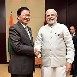 Since establishment of bilateral ties there has been numerous high level bilateral visits between India and Laos. Recent visit was by Vice-President of India Hamid Ansari in September 2015 where he signed 5 "quick impact projects".[3][5] Then Indian Prime Minister Manmohan Singh visited Laos in 2004 for 10th ASEAN Summit where he met Laos PM Bounhang Vorachit, agreements regarding 3rd India-ASEAN summit were signed between them.[6] Indian PM Atal Bihari Vajpeyee visited Laos in 2002. Indian President Pratibha Patil visited Laos in 2010. High level visits from Laos to India were, Prince Souphanouvong, who was the first President of Laos, visited India in 1975. In recent times Laos PM Choummaly Sayasone visited India in 2008. There are several other foreign minister and secretary level visits from each country to other.[1][4]